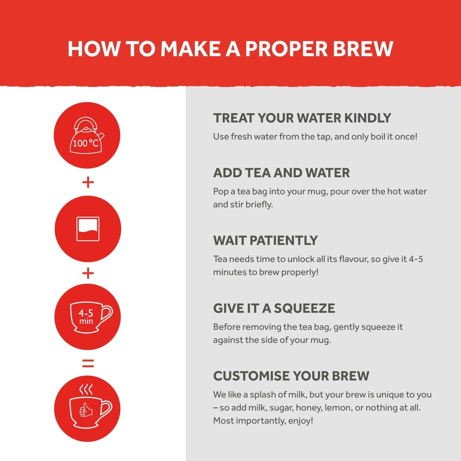 Use one tea bag per cup. Add freshly boiled water and brew for 4–5 minutes. Add milk or sugar to taste.